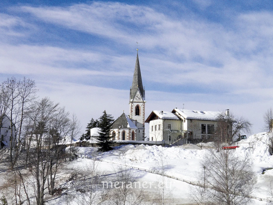 Anfahrt: Mit dem Linienbus oder mit dem Auto bis Hafling; Haltestelle und Parkplatz unterhalb der Kirche.