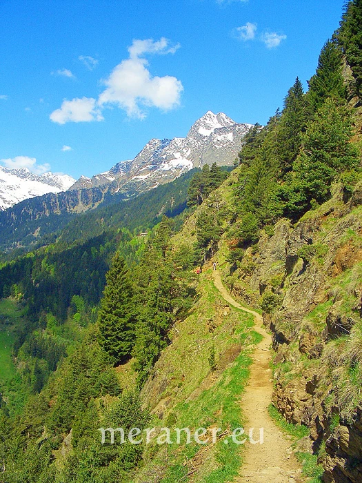 Vom Gasthof Hochmuth (1.362 m) steigen wir kurz auf dem Weg Nr. 24 hinauf zum Gasthof Steinegg (1.439 m) und folgen dann links dem „Hans-Frieden-Weg“, Nr. 24 (Teil des Meraner Höhenweges) bis zur Leiteralm (1.525 m, Einkehrmöglichkeit, kein Ruhetag; ab Hochmuth 1 ½ Stunden). Nun steigen wir auf Weg Nr. 25 kurz bergab, folgen dem Hinweis „Vellau“ nach links und etwas später der Markierung 25 A und dem Hinweis „Oberplatzer und Kienegger“. Ab Oberplatzer (Gasthof ist im Dezember 2009 abgebrannt) wandern wir kurz auf der Asphaltstraße (Nr. 26), bis in einer Linkskurve rechts der Waldweg (Nr. 26) zum Gasthof Kienegger (1.101 m, Einkehrmöglichkeit) hinunterführt.
