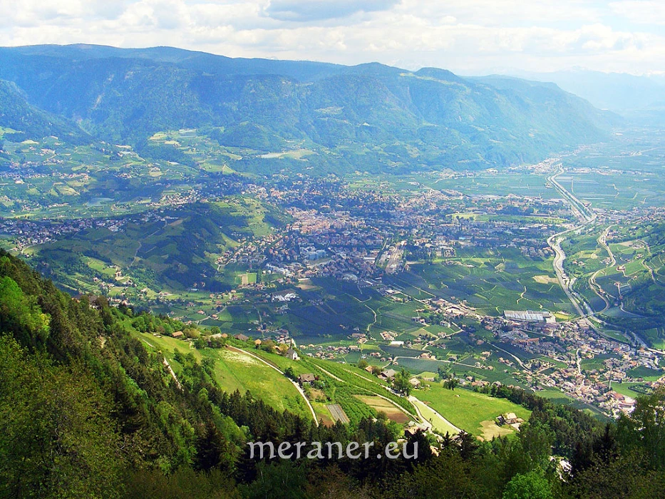 Von Meran nach Dorf Tirol bis zur Talstation der Seilbahn Hochmuth, Bergfahrt zum Gasthof Hochmuth.