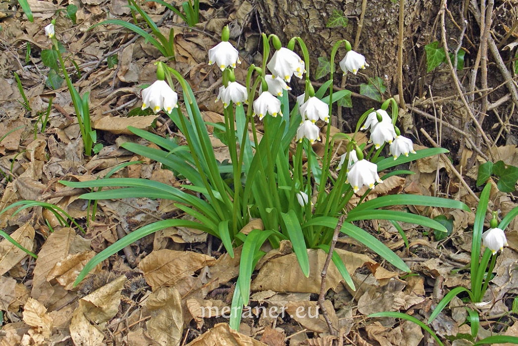 Das Tal, das sich von Montiggl gegen den Kalterer See hinabzieht, wird vom kleinen Angelbach durchflossen, dem Abfluss des Großen Montiggler Sees. Beiderseits des Wasserlaufs breiten sich herrliche Mischwälder aus. Der Frühling bricht hier mit unglaublicher Intensität aus. Die Hänge unter den kahlen Laubbäumen verwandeln sich in einen Blumenteppich, der jeden zum Staunen bringt. Ungezählte Leberblümchen, Frühlingsknotenblumen, gelbe Primeln, Veilchen und andere Frühlingsboten erfreuen hier das Auge und das Herz des Wanderers. Besonders im Vordergrund steht die Frühlingsknotenblume. Diese zu den Amaryllisgewächsen gehörende Pflanze wird im Volksmund manchmal einfach Schneeglöckchen genannt. Doch von dieser nahen Verwandten unterscheidet sie sich durch die breitere Glöckchenform und die knötchenartigen Spitzen an den weißen Blütenblättern.