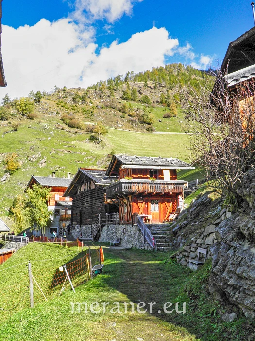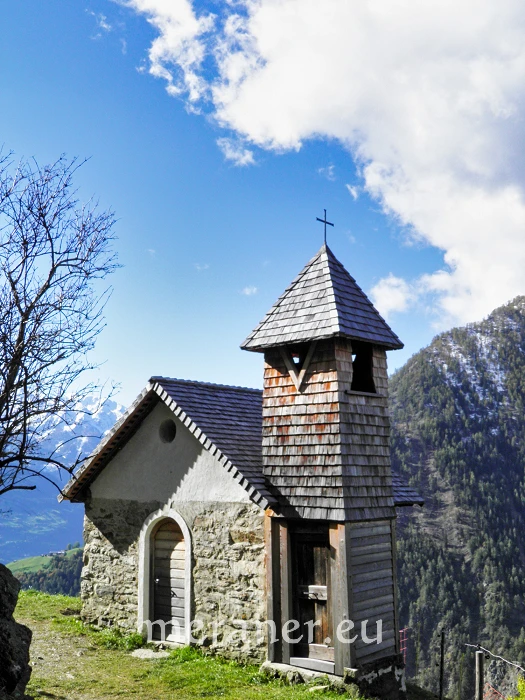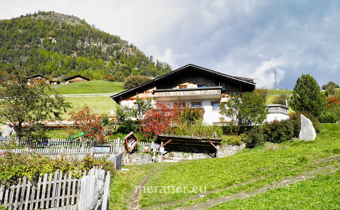 Wegverlauf: Von der Bushaltestelle in Katharinaberg (1.245 m) gehen wir auf der Asphaltstraße bergauf, bis nach einer Kurve rechts der Wiesenweg Nr. 10 A abzweigt, der hinaufführt zum querenden Meraner Höhenweg (Nr. 24), dem wir nach rechts folgen. Bald erreichen wir den Hof Unterperfl, von dem wir über eine kurze Steintreppe hinuntersteigen und einen Bergbach überqueren. Nach einem Anstieg wandern wir an den Hängen weiter zu den Höfen Wand und Kopfron. Kurz nach dem Hof Kopfron führt der Weg links am Hang hinauf und durch Wald zum Hofschank Wald mit der auffallenden Kapelle (1.505 m, Einkehrmöglichkeit Frühjahr bis Herbst, Freitag Ruhetag). Wir wandern am Osthang des Schnalstales weiter und erreichen den Hof Inner-Unterstell. Wir folgen weiterhin dem Meraner Höhenweg, steigen nach einer Weggabelung (hier kann man auch direkt zum Gasthof Patleid weitergehen) noch einmal links am Hang empor, wandern nun über Trockenwiesen zum Linthof (1.464 m, Einkehrmöglichkeit bis Ende November), verlassen dort den Meraner Höhenweg und steigen auf dem schmalen Weg Nr. 10 A hinunter zum Gasthof Patleid (1.386 m, Einkehrmöglichkeit ganzjährig, Montag Ruhetag) und weiter hinunter zum Gasthof Unterstell (1.282 m, Einkehrmöglichkeit, Freitag Ruhetag) und zur Bergstation der Seilbahn Unterstell, mit der wir wieder Naturns erreichen.