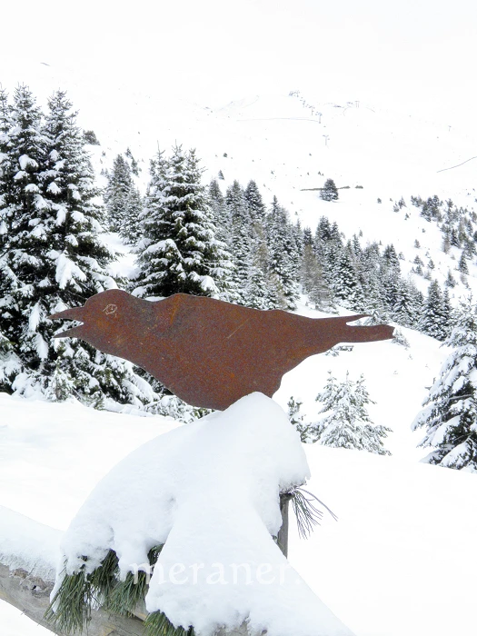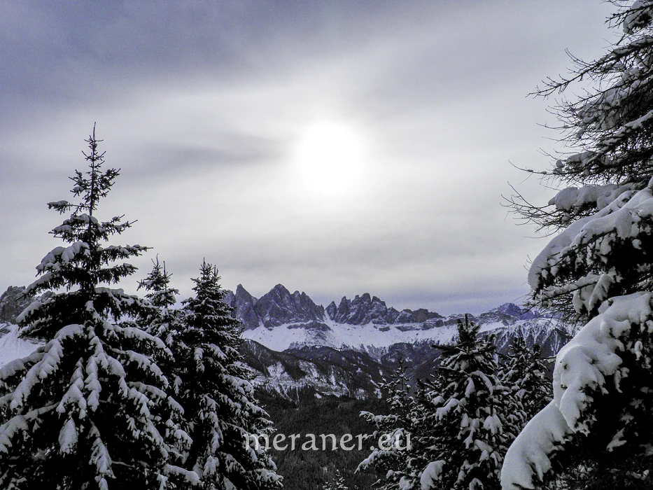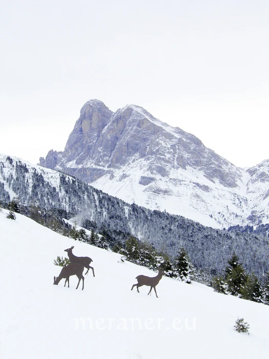 Wegverlauf: Von der Sonnenterrasse des Restaurants an der Bergstation der Seilbahn steigen wir eine Treppe hinunter und folgen kurz der Straße bergab zur Straßenkreuzung, wo wir uns nach links wenden und auf der Straße nach wenigen Metern (Hinweis „Winterwanderweg“) den Gasthof Geisler (Einkehrmöglichkeit) erreichen. Gleich nach der Überquerung einer Skipiste beginnt der breite, gut gewalzte Weg, der uns in leicht ansteigender Querung der weiten Schneehänge in gemütlicher Wanderung zur Rossalm (2.200 m, Einkehrmöglichkeit; ab Parkplatz gut 1 Stunde) führt.