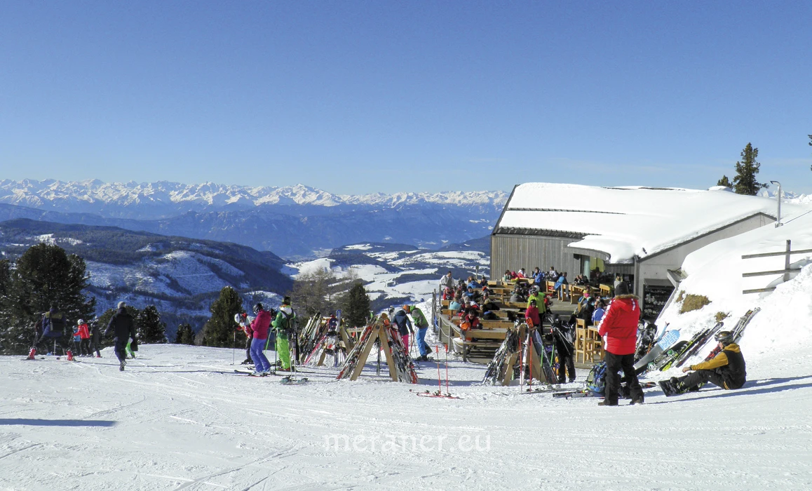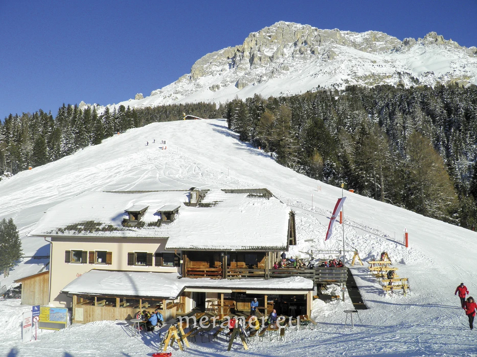 Kurz vor der Unterführung zweigt links ein gebahnter Fußweg (Hinweis „Berghütte Oberholz“ und Markierung Nr. 18) ab. Auf diesem steigen wir nun etwas steiler bergauf und gelangen zu einem breiten, gebahnten Forstweg, wenden uns nach links und wandern stets leicht ansteigend hinauf zur Berghütte Oberholz (2.096 m, Einkehrmöglichkeit bis Ostern; ab Epircher-Laner-Alm 1 Stunde 15 Minuten).