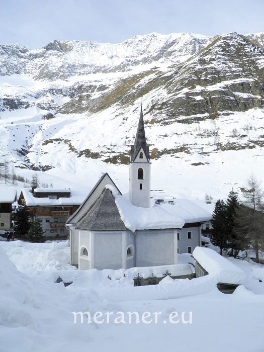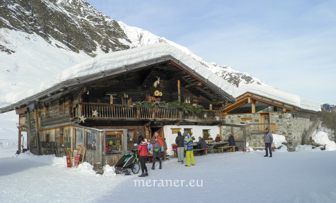 Besonderheiten: Der hinterste Teil des Pfelderer Tales eignet sich dank geräumter, nur mäßig ansteigender Wege und dank der schneesicheren Lage auch im Winter sehr gut zum Wandern. Während im Dorf und auf den Pisten reges Treiben herrscht, können wir im Talschluss eine Landschaft von großer Stille und Schönheit genießen. Die nahezu ebene, freie Fläche wird überragt von der Hochwilde, einer mächtigen Berggestalt von fast 3.500 m Höhe. Die Lazinser Alm wurde neu errichtet und ist nun auch im Winter geöffnet.