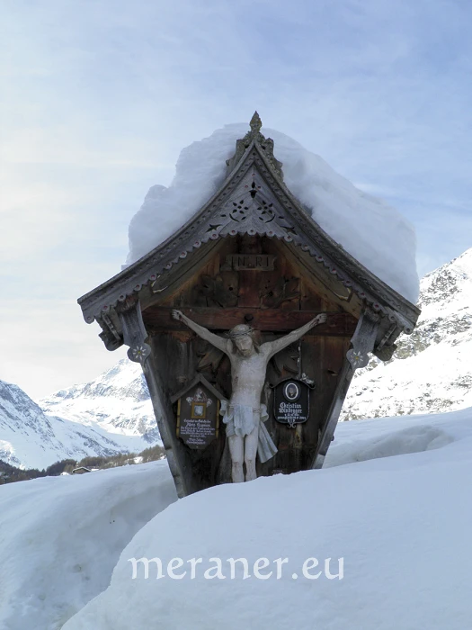 Wegverlauf: Vom Parkplatz gehen wir auf der Straße bis ins Dorf, folgen der Beschilderung „Gasthof Edelweiß“ und überqueren links davon den Talbach. Auf der leicht ansteigenden Fahrstraße erreichen wir die Häusergruppe „Zeppichl“ (1.676 m; Einkehrmöglichkeiten). Nun steigen wir durch verschneite Wiesen und lichten Wald kurz an bis zu einem Bildstock und erreichen großteils eben über freie Wiesen das Gasthaus Lazins (1.772 m, Einkehrmöglichkeit, Montag Ruhetag; ab Parkplatz ca. 1 Stunde). Dann wandern wir auf gebahntem Weg über sonnige Hänge taleinwärts oder überqueren erneut den Talbach und wandern auf gebahntem Weg, der streckenweise auch Langlaufloipe ist, leicht ansteigend bis zum Talschluss bei der Lazinser Alm (1.850 m, Einkehrmöglichkeit, Freitag Ruhetag; ab Lazins ½ Stunde).