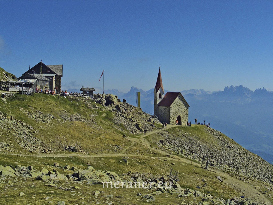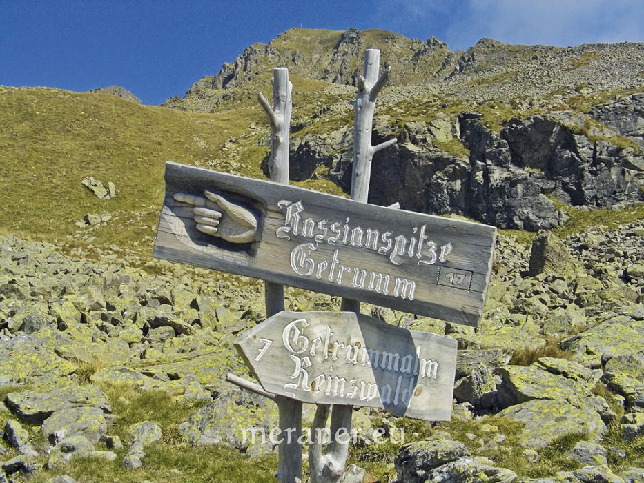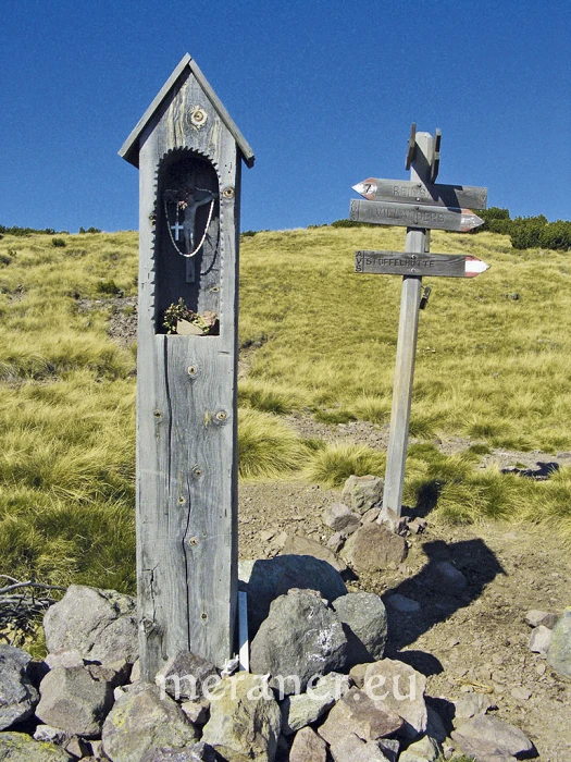 Wegverlauf: Vom Parkplatz an der Talstation (1.570 m) folgen wir der Markierung Nr.7 und erreichen nach großteils nur mäßig steiler Wanderung die Getrumalm (2.100 m, Einkehrmöglichkeit; ab Parkplatz gut 1 ½ Stunden). Nun wandern wir auf Steig 7 mäßig steil weiter zum Lückl (2.378 m), einer Grassenke, und jenseits hinunter zu Schutzhaus und Kirche Latzfonser Kreuz (2.300 m, Einkehrmöglichkeit; ab Getrumalm 1 ½ Stunden). Auf dem nach Süden führenden Steig Nr. 1 erreichen wir nach leichtem Anstieg das Wegkreuz an einem Bergrücken und wandern leicht absteigend und eben über die Bergweiden der Jocherer Alm bis zu einer Senke mit Zaun und Bildstock (2.160 m; ab Latzfonser Kreuz 1 ½ Stunden). Nun folgen wir dem Weg nach rechts (Wegweiser Reinswald und Nr. 7 bzw. 1A) und wandern ziemlich steil hinunter zum Getrumbach. Auf dem links abzweigenden Mühlenweg (Nr. 7 A) wandern wir entlang des rauschenden Baches talauswärts, vorbei an den Reinswalder Mühlen (1.555 m, Einkehrmöglichkeit) bis zum Ausgangspunkt (ab Bildstock 1 ½ Stunden).