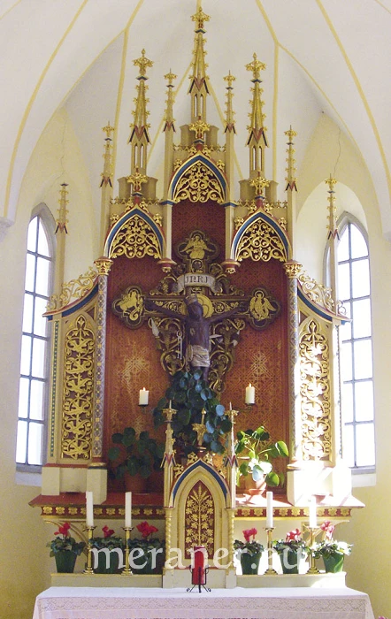 Das Kirchlein am Latzfonser Kreuz ist die höchstgelegene Wallfahrtskirche Südtirols und die Pilgerstätte zählt zu den höchsten Europas. Es wurde 1868 an der Stelle einer 1743 erbauten Kapelle erbaut. Im Sommer steht in dem gefälligen neugotischen Bau der viel verehrte „Schwarze Herrgott“, ein angeblich mit Ochsenblut und flüssigem Baumharz bemalter Christus aus gotischer Zeit. Dieser Gekreuzigte befand sich ursprünglich in der Totengruft von Latzfons, wurde im Jahre 1700 dann oben am Berg als Wetterkreuz aufgestellt und erhielt schließlich das heutige Kirchlein. Laut einer alten Erzählung hatte ein Bauersknecht einst dieses Kreuz als Zielscheibe für seine Schießkünste benutzt, wovon man heute noch die Einschussstelle sehen kann. Bald darauf wurde der Frevler genau an der Stelle, an der er geschossen hatte, von einem Stier aufgespießt und musste jämmerlich verbluten.