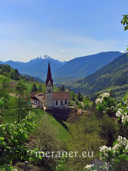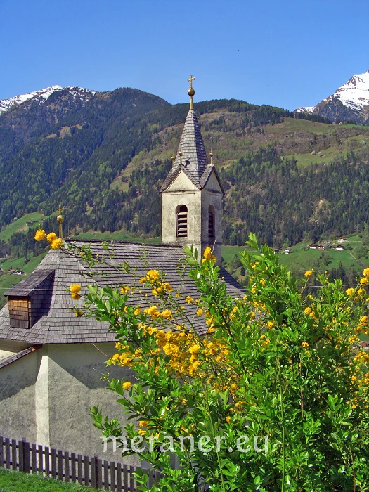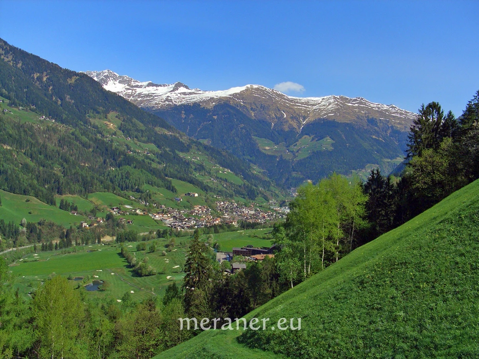 Wenige Schritte nach der Bushaltestelle folgen wir der Markierung Nr. 5 rechts hinab, überqueren auf der St.-Johannes-Brücke die Passer, wandern rechts auf der Straße bis zu einem Bildstock und dort wieder rechts weiter, vorbei am Golfplatz bis zum Bucherkeller (Einkehrmöglichkeit, Montag Ruhetag; ab Parkplatz 20 Minuten). Nun überqueren wir den Grafeisbach und steigen auf dem Stationenweg (Markierung 5) etwas steil hinauf zum Wallfahrtskirchlein der „Mutter zum guten Rat“ in der Mörre (571 m, Einkehrmöglichkeit im nahen Gasthof; ab Bucherkeller 50 Minuten). Nun folgen wir der Markierung Nr. 6A und dem Hinweis „Schweinsteg“ und erreichen auf einem Waldweg in wechselndem Auf und Ab den Buschenschank „Außerstauderhof“ (Einkehrmöglichkeit). Wir wandern auf der Straße kurz abwärts, dann rechts ab und durch Wiesen und Wald bis zu einer Weggabel. Hier folgen wir dem Hinweis „Schweinsteg“ (Nr. 6) und gelangen zur Straße und hinunter nach Schweinsteg (693 m, keine Einkehrmöglichkeit; ab Mörre 1 Stunde). Nun steigen wir auf der Straße in mehreren Kehren hinab zur Passer und folgen dieser auf dem Radweg auf der orografisch linken Seite hinaus bis Saltaus (ab Schweinsteg 1 Stunde).