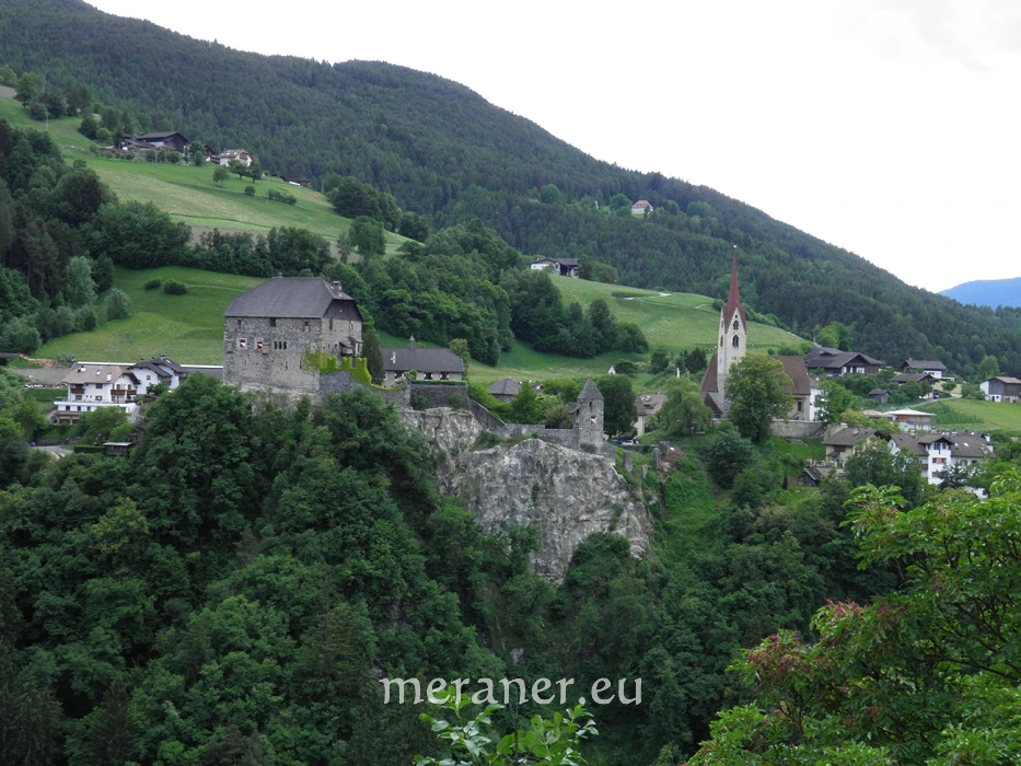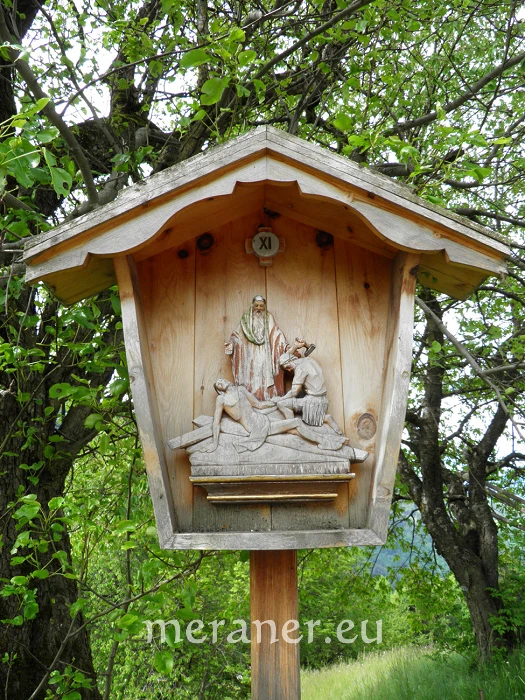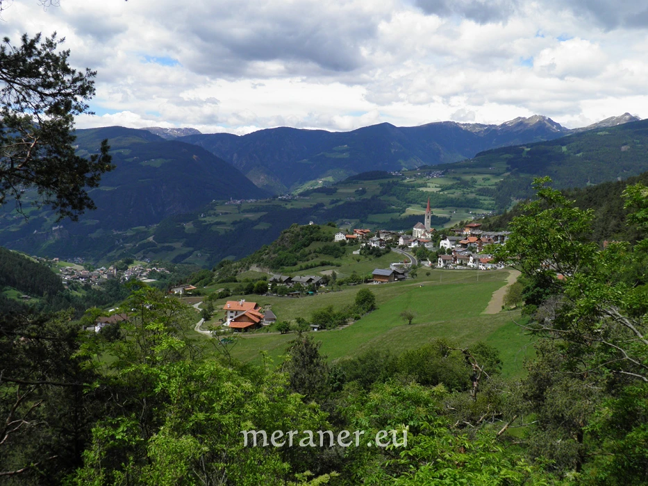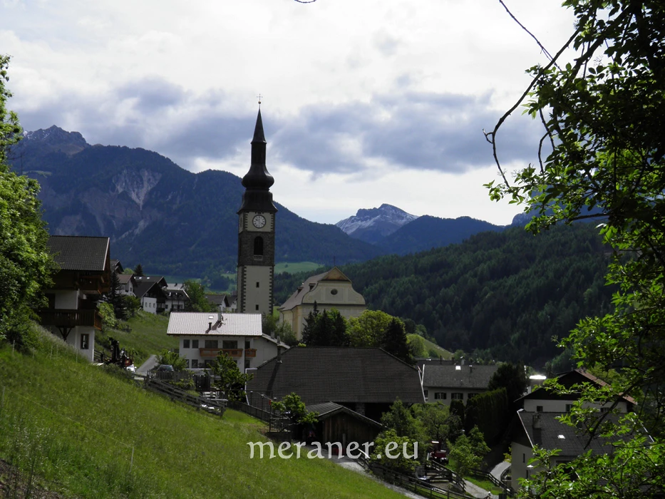 Wegverlauf: Von der Bushaltestelle (1.150 m) gehen wir am Gasthof Lamm vorbei auf dem alten Kirchweg hinauf Richtung Pfarrkirche von St. Peter, am Gasthof Kabis links vorbei bis zu einer Weggabelung. Hier folgen wir rechts der Markierung Nr. 30 und dem Hinweis St. Jakob und wandern auf der schmalen Asphaltstraße mit den Kreuzwegstationen leicht ansteigend zum Kirchlein St. Jakob (1.280 m). Wir folgen weiterhin der Straße (Nr. 30, Hinweis „Jochhöfe“) durch Wiesen und Wald und erreichen die bereits 1238 erwähnten Jochhöfe, die einen kleinen Weiler bilden. Einer davon ist die Jausenstation Moar (1.320 m, Einkehrmöglichkeit, Montag Ruhetag, im Sommer kein Ruhetag; ab St. Peter knapp 1 ½ Stunden). Auf der Straße unterhalb vom Moar (Nr. 12) wandern wir hinunter zum Zinnerhof, auf dem oberen Feldweg westwärts hinüber zum Wald und auf dem markierten Steig durch steilen Wald hinunter zum breiten Weg Nr. 11, auf dem wir nach Teis gelangen (962 m; Einkehrmöglichkeiten; ab Jausenstation Moar 50 Minuten). Nun folgen wir dem Hinweis „Nafen“ und der Markierung Nr. 11 und wandern bergab nach Nafen (797 m), weiter auf dem Fußweg (immer Nr. 11) teils steil durch Wald hinunter in die „Schmelze“ (550 m) an der Villnösser Talstraße und unter der Autobahn hindurch zurück zum Parkplatz (ab Teis 1 Stunde).