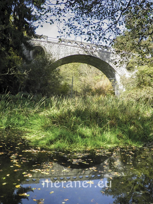 Rückweg: Entweder wie Hinweg (bei schlechten Wegverhältnissen) oder: Von der Kirche steigen wir (Nr. 7) zunächst über Felsstufen westseitig hinunter ins „Sautalele“ und wandern dort links (Nr. 7) weiter zum Narauner Weiher (mehrere Schautafeln) und zur Bogenbrücke der Gampenstraße. Auf dem beschriebenen Hinweg kehren wir nach Tisens zurück (ab St. Hippolyt 1 Stunde).