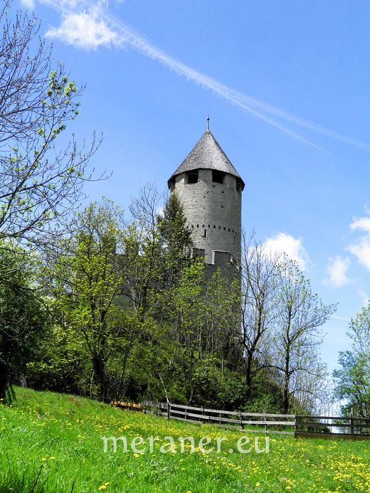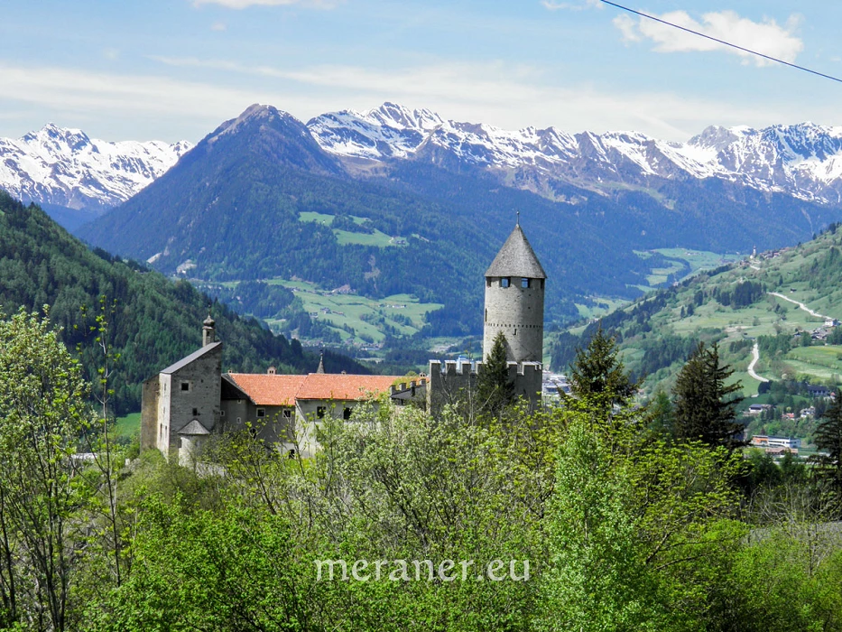 Wegverlauf: Von der Kirche in Maria Trens (987 m) folgen wir der Markierung 24 und der Beschilderung „Sprechenstein“ zuerst durch Wiesen und an einigen Häusern vorbei nordwestwärts zum Wald. Wir steigen mäßig steil bergan und queren den Wald bis zu einer Wegteilung (ca. 1.200 m). Nun wandern wir links (Nr. 24 B) in leichtem Abstieg mit ein paar Serpentinen und durch eine Wiese zur Hofschenke (Einkehrmöglichkeit, Dienstag und Mittwoch Ruhetag) und zur nahen Burg Sprechenstein (1.170 m, das Innere nicht zugänglich; ab Trens gut 1 Stunde).