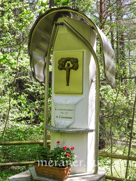 Kurz vor der Burg folgen wir dem Hinweis „Burgfrieden“ (Nr. 24 A) und erreichen auf einem schmalen, aber gut begehbaren Steig in Serpentinen durch einen Grashang bergab den Talboden und den Gasthof „Burgfrieden“ (939 m, Einkehrmöglichkeit). Hier überqueren wir die Straße, wenden uns nach links und wandern auf dem Pilgerweg (entsprechende Beschilderung und Hinweis „Trens“) parallel zur Staatsstraße südostwärts, überqueren bei der Reiterkapelle erneut die Straße und gelangen, mäßig ansteigend, zurück nach Trens (ab Sprechenstein knapp 1½ Stunden).