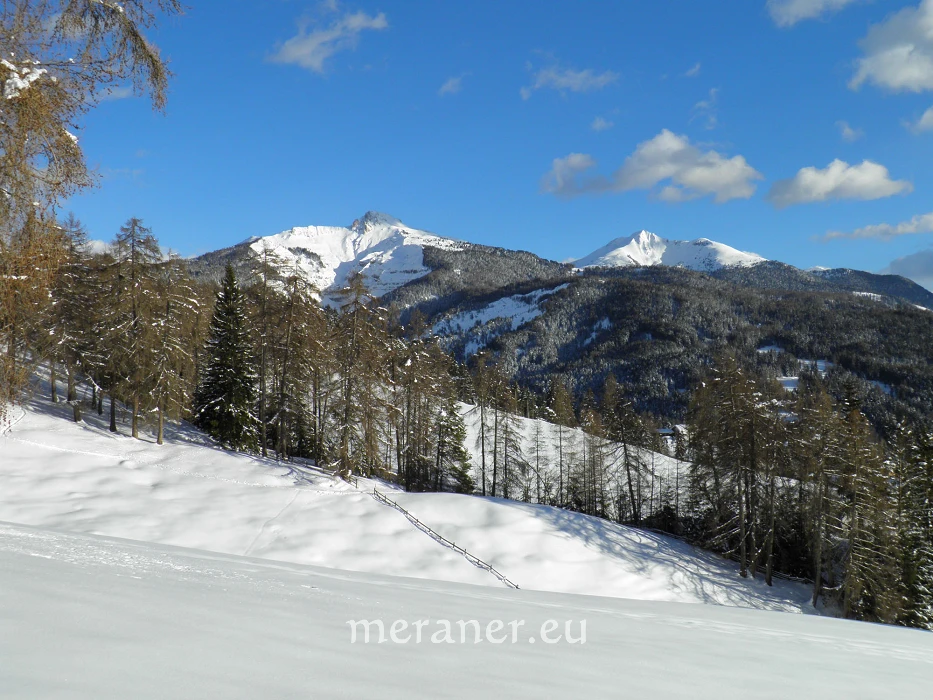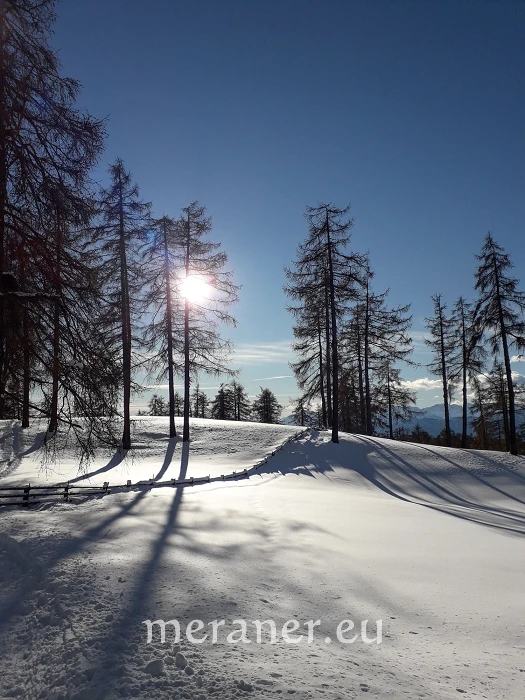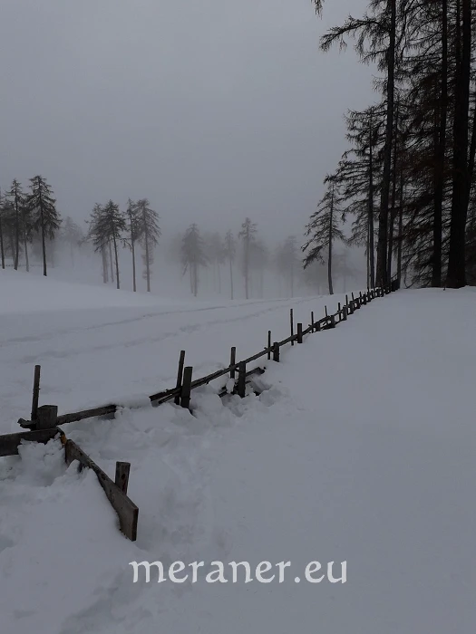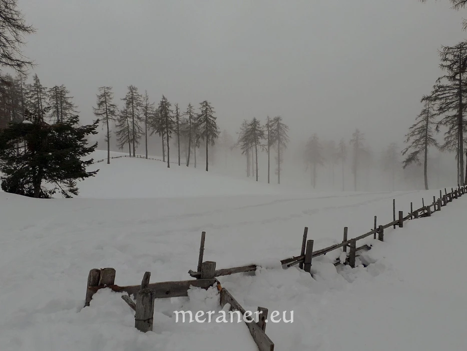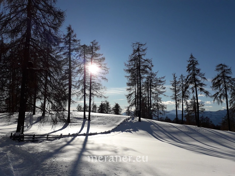 Besonderheiten: Die Wanderung führt uns entlang schöner Holzzäune und durch ausgedehnte Lärchenhaine, die sogenannten Stockwiesen, die jenen des Saltens am Tschögglberg zwar nicht an Größe, wohl aber an landschaftlicher Schönheit ebenbürtig sind. Der Lichteinfall der Sonne erzeugt zwischen den Bäumen ein besonderes Glitzern und Funkeln der Schneekristalle.