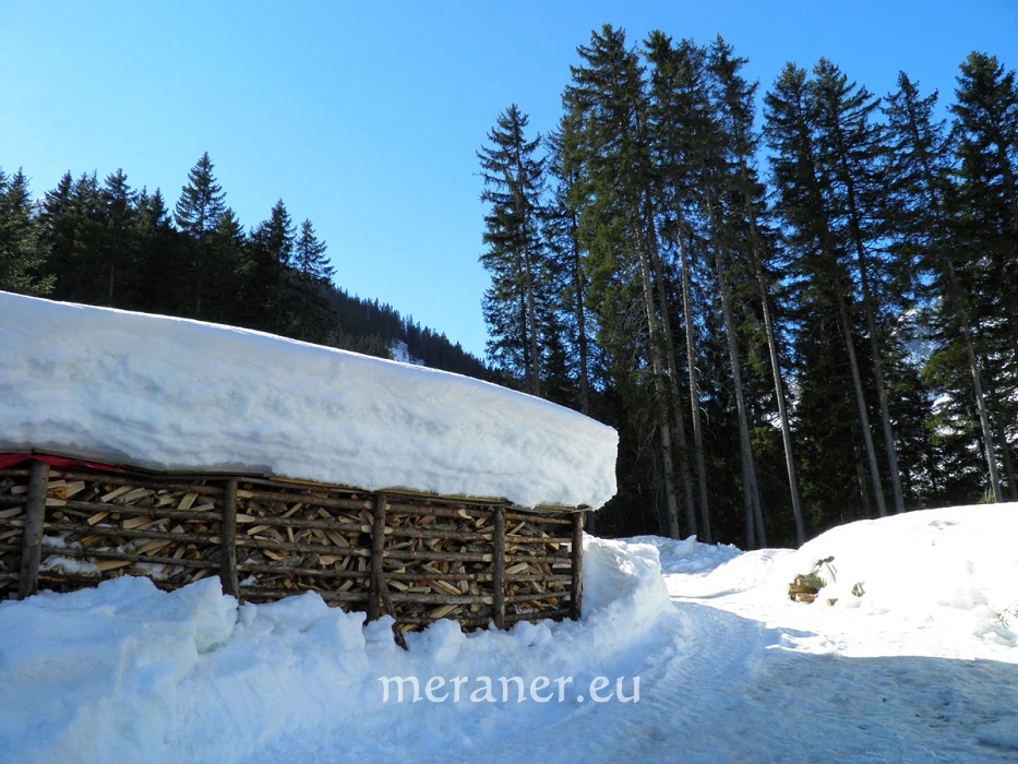 Besonderheiten: Dieses Winterwanderziel trifft man meist tief verschneit an und die Rodelbahn ist auch für Kinder gut und gefahrlos befahrbar. Alle in Holz errichteten Hütten bilden einen harmonischen, kleinen Weiler. Die Alm bietet sowohl im Sommer als auch im Winter eine gemütliche Einkehrmöglichkeit. Von der Alm aus können wir auch eines der schönsten Bilder unseres Landes genießen: Auf der gegenüberliegenden Talseite erhebt sich vor unserem Auge die alles beherrschende Berggestalt, der über 3.000 Meter hohe Tribulaun. Er zeigt sich uns in seiner beeindruckenden, majestätischen Größe.