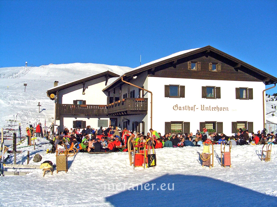 Von der Bergstation der Umlaufbahn (2070 m) wandern wir auf breitem Weg nahezu eben zum Gasthof Unterhorn (Einkehrmöglichkeit) und an der nahen Feltunerhütte (Einkehrmöglichkeit) vorbei in einer weiten Schleife auf einem gebahnten Weg westwärts und schließlich in leichtem Anstieg bis auf die Gipfelkuppe (2270 m; ab Bergstation ca. 1 ½ Stunden). Im Winter ist das Schutzhaus geschlossen, aber in einer kleinen Hütte etwas unterhalb erhält man Getränke und kleine Imbisse. Der Abstieg zum Unterhornhaus erfolgt auf dem Hinweg oder direkt auf dem neben dem Schlepplift gebahnten Fußweg zum Gasthof Unterhorn. Von dort wandern wir auf breitem Weg dem Schild „Talstation“ folgend abwärts bis zu einer nahezu ebenen Hochfläche. Hier nehmen wir nicht den Weg über die Mittelstation, da dieser als Rodelweg benützt wird, sondern wenden uns nach rechts. Auf breitem Weg und zum Schluss auf asphaltierter Straße kehren wir nach Pemmern zurück (ab Gipfel ca. 2 Stunden).