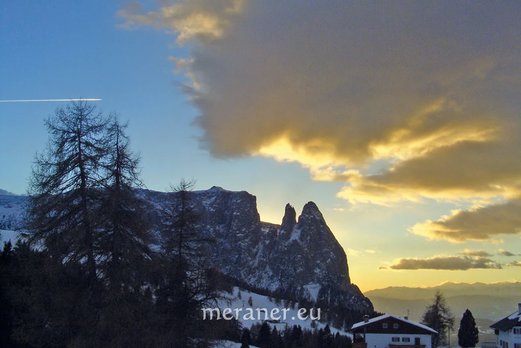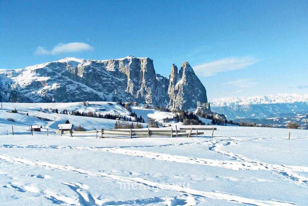 Die Wanderung durchquert eine herrliche Schneelandschaft. Der Blick reicht über die gesamte Seiser Alm, die mit einer Ausdehnung von ca. 50 Quadratkilometern als größte Hochalm Europas gilt, bis hin zu den unzähligen Gipfeln des Alpenhauptkammes. Doch auch die nahe Silhouette des Schlern und das Bergmassiv der Langkofelgruppe versetzen uns immer wieder in Staunen.