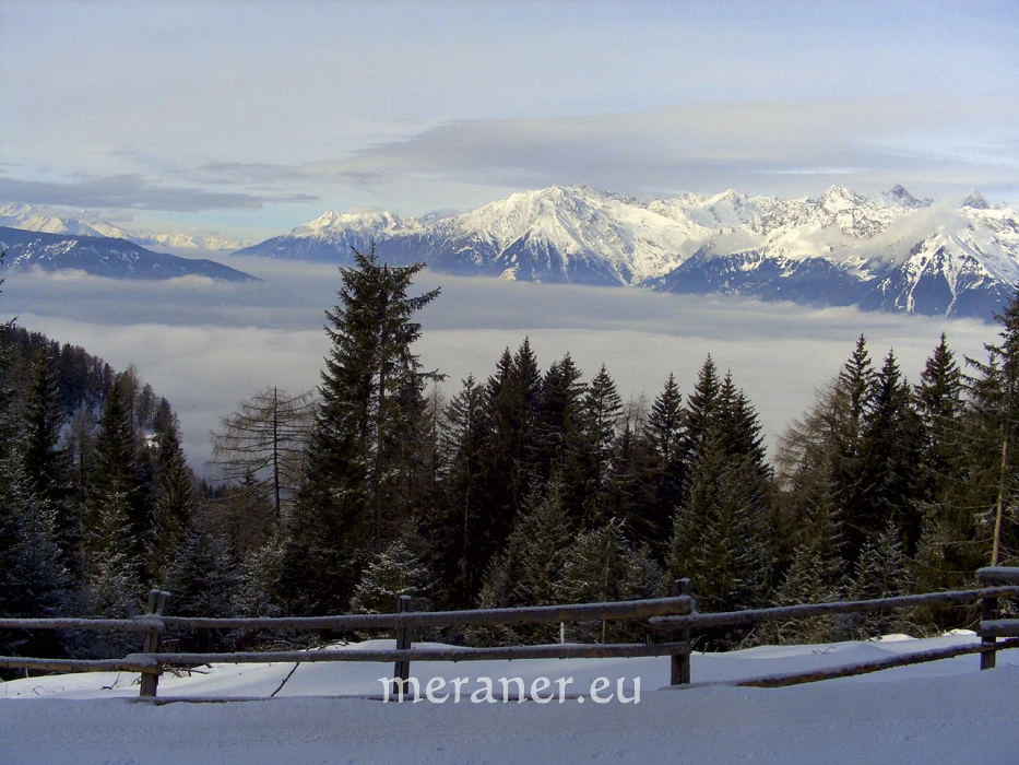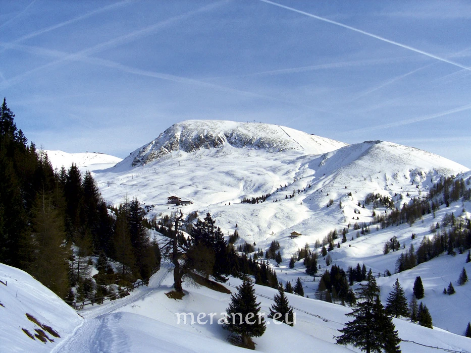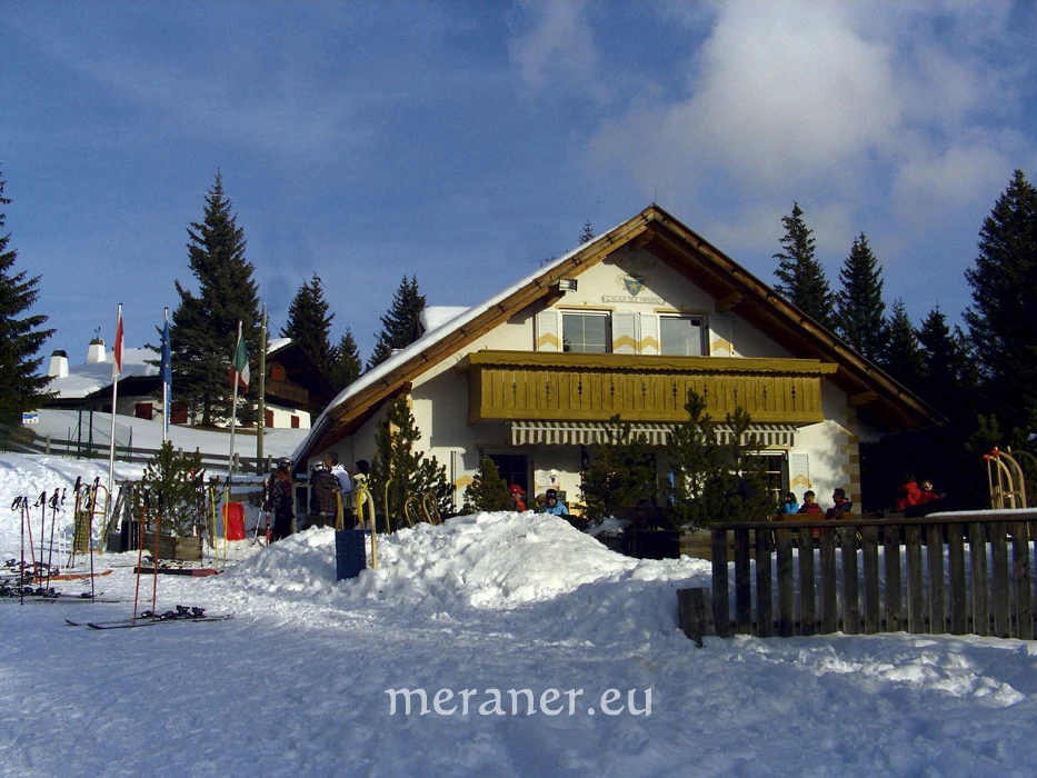 Von Falzeben (1620 m) wandern wir auf dem breiten, gebahnten Winterwanderweg, dem Hinweis „Meraner Hütte“ folgend, durch Wald hinauf zur Zuegghütte (1.766 m, Einkehrmöglichkeit; ab Parkplatz 30 Minuten; in der Nähe die Rodelbahn) und weiter zur Rotwandhütte (1.817 m, Einkehrmöglichkeit; ab Zuegghütte 10 Minuten). Nun folgen wir der Markierung Nr. 14, gelangen bald auf freie Hänge, die wir nahezu eben queren, und erreichen nach kurzem Aufstieg die Kirchsteiger Alm (1.945 m, Einkehrmöglichkeit) und die Meraner Hütte (1.960 m, Einkehrmöglichkeit, ab Rotwandhütte 1 Stunde 20 Minuten).