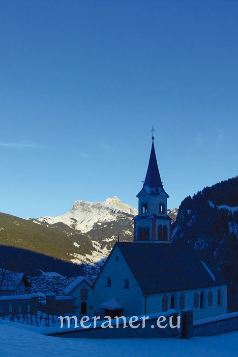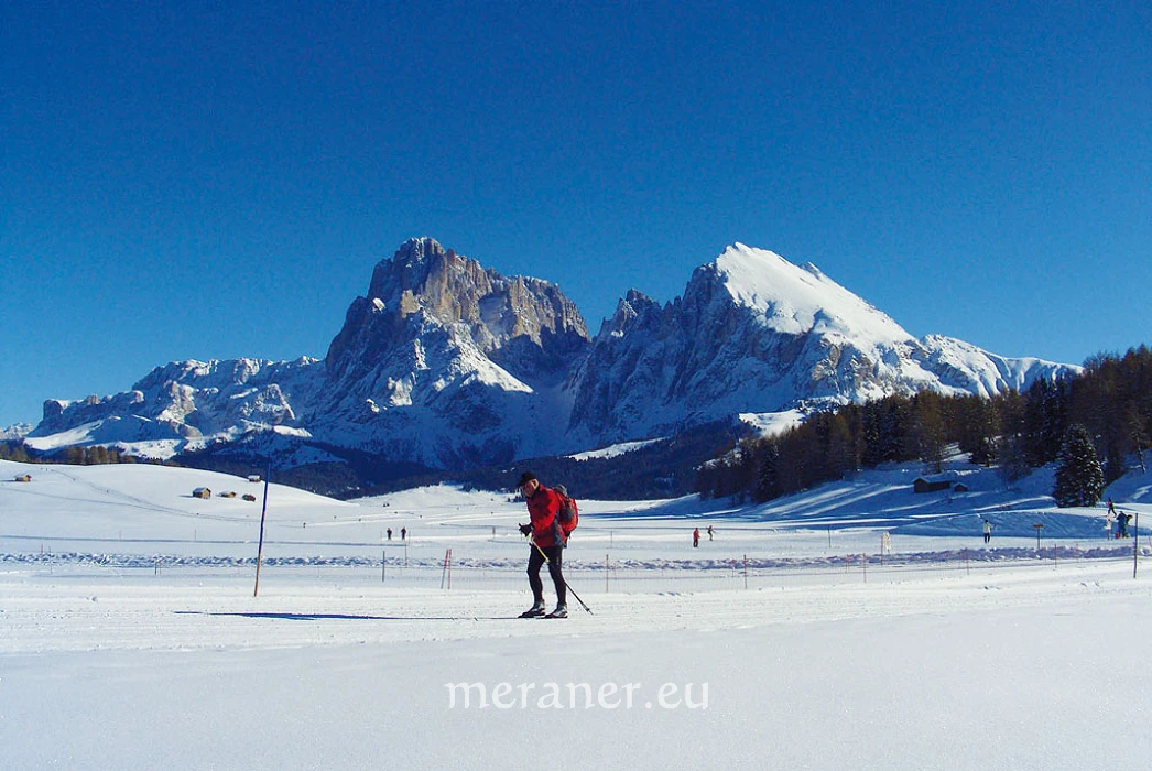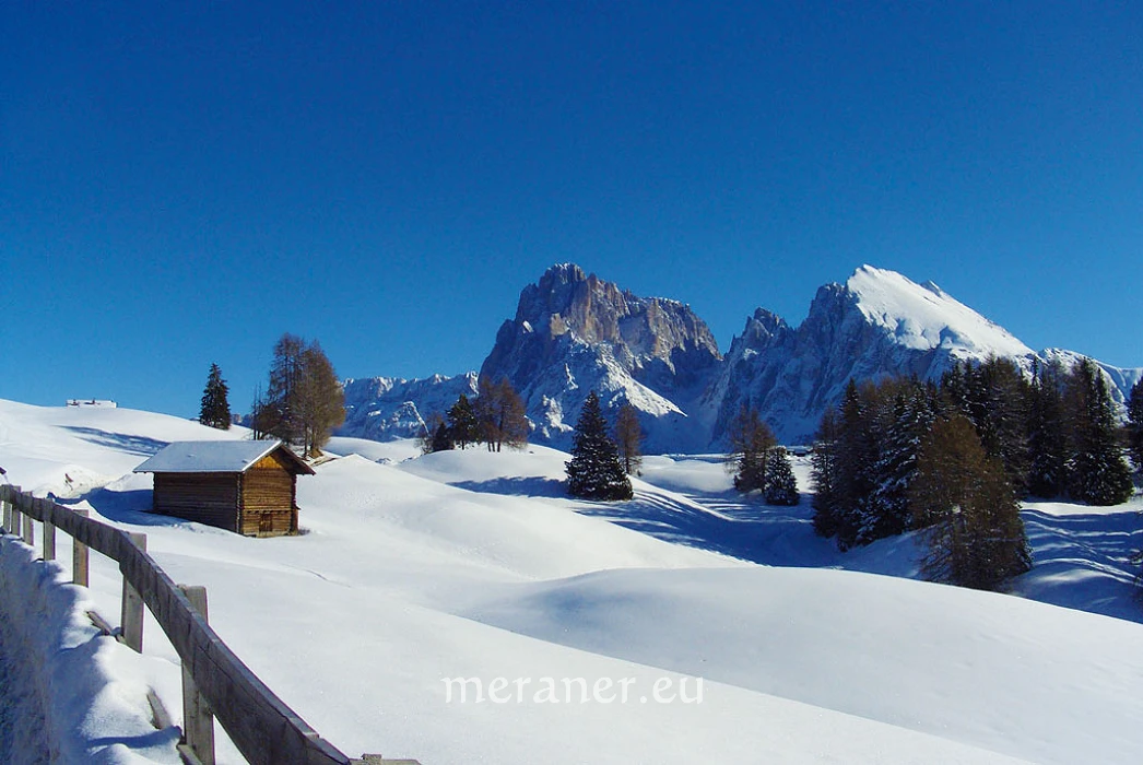 Pufels liegt auf einer sonnigen Terrasse mit freiem Blick auf das Grödner Tal und seine Berge. Weil der Weg von Pufels zur Seiser Alm zu den weniger bekannten Routen gehört, können wir die verschneite Winterlandschaft in Ruhe genießen. Der Wanderweg führt im oberen Teil in den von Felsen gesäumten schmalen Grund der Pufler Schlucht. Um so beeindruckender ist der Moment, wenn wir aus dem waldreichen Hochtal hinaustreten in die sonnenüberflutete Weite der Seiser Alm. Genussreich ist auch der Anblick der mächtigen Bergriesen Langkofel und Plattkofel, während im Westen der Schlern hinter den Schneefeldern hervorragt. Die Ritsch Schwaige ist ein Berggasthof, der sich aus einer der zahllosen Almhütten entwickelt hat, die Schwaigen genannt werden.