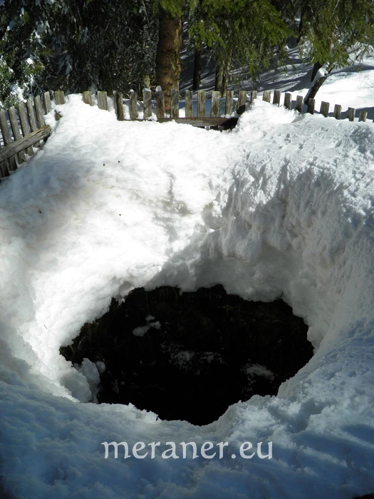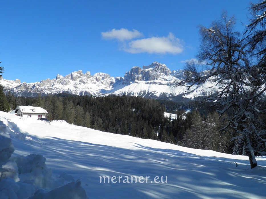 Wegverlauf: Vom Kirchplatz in Welschnofen (1.174 m) folgen wir der Markierung Nr. 5 an Häusern vorbei ein Stück bergan und wandern auf einem breiten Weg nahezu eben ostwärts, bis links ein alter Fußweg (Nr. 4) abzweigt. Auf diesem steigen wir durch Wald bergan bis zu einer Weggabelung. Hier wenden wir uns nach links (Markierung Nr. 5 und Hinweise „Schillerhof“ und „Wolfsgrube“) und steigen auf dem ausgetretenen Fußweg durch Wald stetig bergan zu einer Marienkapelle und zum Wolfsgrubenjoch (1.506 m; hier die unten erwähnte Wolfsgrube). Nun folgen wir dem breiten, gebahnten Weg mit der Nr. 1 und erreichen bald den Schillerhof (1.555 m, Einkehrmöglichkeit, bis Anfang April geöffnet, Dienstag Ruhetag; ab Welschnofen 1 ½ Stunden).