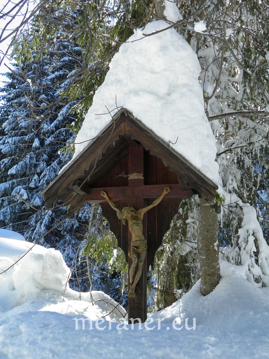 Rückweg: Wir folgen dem breiten Weg Nr. 1 ostwärts bis zur Weggabelung, dort wenden wir uns nach rechts und erreichen auf dem breiten Weg Nr. 4A nahezu eben die „Hagneralm“ (1.556 m; im Winter geschlossen). Nun steigen wir, zuerst auf dem Forstweg, dann auf der asphaltierten Höfezufahrt durch das romantische kleine Waldtal dem Hagnerbach entlang hinunter zum nordöstlichen Dorfrand, wenden uns an einer Brücke nach rechts und gelangen nahezu eben zum Weg Nr. 5 und zurück zum Kirchplatz (ab Schillerhof 1 ½ Stunden)