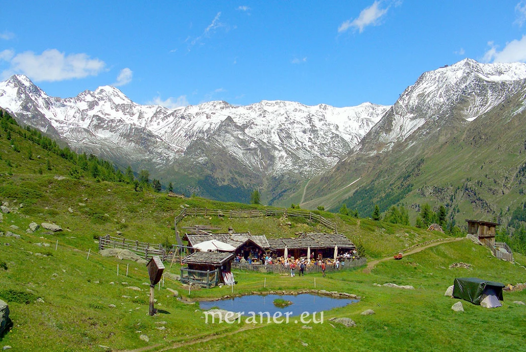 Variante: Die Alm ist auch von Kurzras (2011m; hinterstes Dorf im Schnalstal) auf Weg Nr. 5 erreichbar (Höhenunterschied: ca. 200 m; Gehzeit: ca. 1 ½ Stunden).