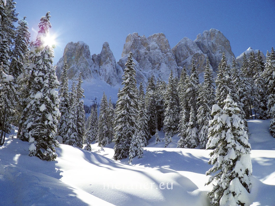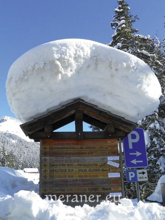 Wegverlauf: Von der kleinen Hütte „Zanser Alm“ direkt am Parkplatz (hier Rodel- und Skischuhverleih) wandern wir, stets der Winterbeschilderung „Gampenalm“ folgend, zuerst ein Stück auf dem Rodelweg bis zur Wegteilung, dann rechts auf dem den Fußwanderern vorbehaltenen Forstweg in Kehren durch den Wald hinauf zur Baumgrenze, kurz weiter zu einem flachen Wiesensattel und – das letzte Stück wieder auf dem Rodelweg – durch die freien Hänge mäßig ansteigend zur Gampenalm (2.062 m, Einkehrmöglichkeit, Montag und Dienstag Ruhetag; ab Zans 1 ½ Stunden).
