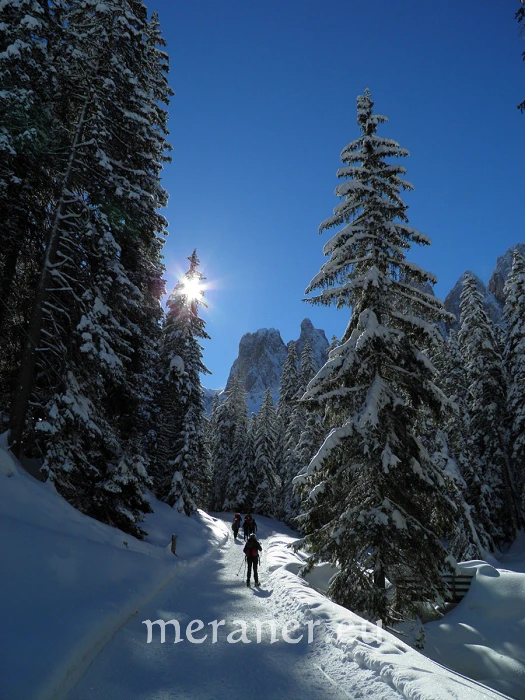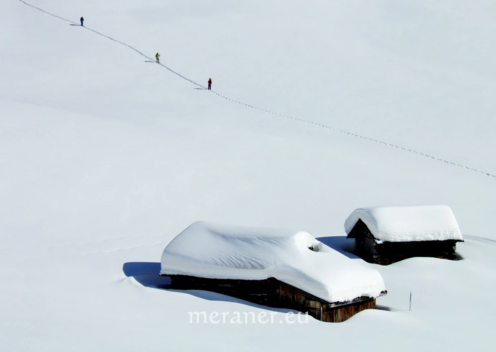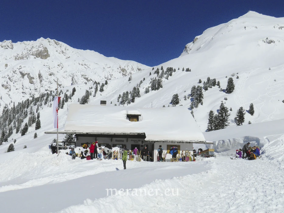 Variante für den Hinweg: Von den Parkplätzen wandern wir in wenigen Minuten zur neu erbauten Zanser Schwaige (1.685 m, Einkehrmöglichkeit), dann stets auf gebahntem Schneeweg durch das Tschantschenontal hinein und durch den Wald stärker ansteigend zu einer Weggabelung mit zahlreichen Wegweisern. Wir wenden uns nach links und gelangen zur Baumgrenze und durch freie Schneehänge leicht ansteigend zur Gampenalm (ab Zans gut 1 ½ Stunden; für schneegewohnte Winterwanderer problemlos).