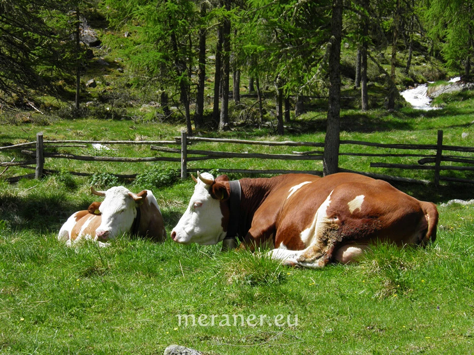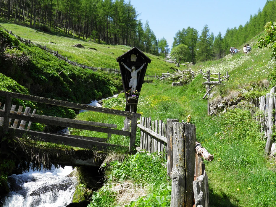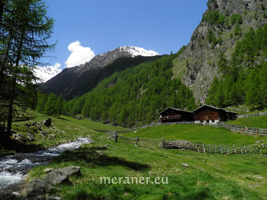 Besonderheiten: Die Mastaunalm liegt im gleichnamigen Hochtal, das bei Unser Frau westlich vom Schnalstal abzweigt und sich bis zu einem über 3.000 m hohen Bergkranz hinaufzieht. Durch das Tal fließt ein Bach mit kristallklarem Wasser und bildet kurz vor seiner Einmündung in den Schnalser Bach einen 28 m hohen Wasserfall. Nach dem Anstieg durch einen Lärchenwald erreichen wir zuerst den Mastaunhof, der in aussichtsreicher Lage ein paar malerische Holzgebäude mit Schindeldächern umfasst. Er wurde bereits im Jahre 1356 urkundlich erwähnt und ist mit einem Grundbesitz von mehr als 1.100 ha der größte Bauernhof des Schnalstals. Auf einem mit Steinplatten ausgelegten alten Weg erreichen wir die verwitterten Gebäude der Mastaunalm, die einst ganzjährig bewohnt waren. Auch hier säumen den flachen, gerodeten Talboden mächtige Lärchen, die im Frühling durch ihr helles, frisches Grün genauso bezaubern wie im Herbst mit ihrem bunten Farbenkleid.