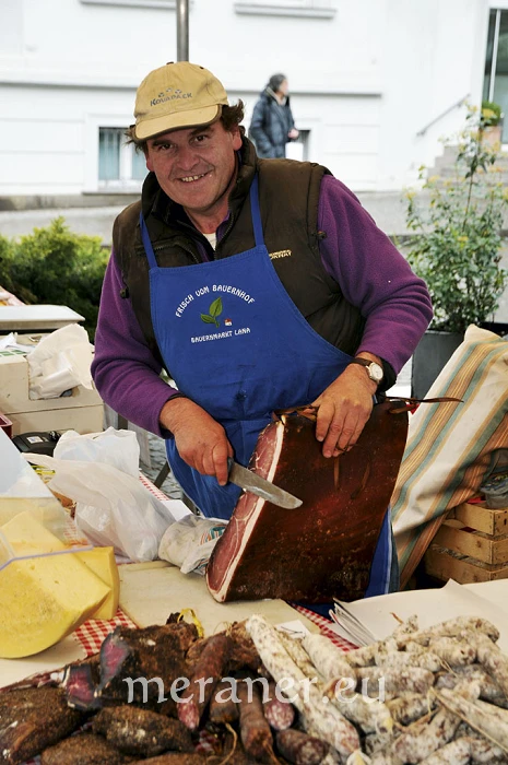 „Wir werden gut akzeptiert und fühlen uns hier wohl. Anfangs war natürlich weniger los, aber jetzt hat es sich eingependelt“, sagt der Obmann des Obermaiser Bauernmarktes, der Imker Georg Eller. Am 3. April feiert der Bauernmarkt am Brunnenplatz sein zweijähriges Bestehen mit einem Umtrunk. Dass die Bemühungen um einen Bauernmarkt in Untermais nicht gefruchtet haben, das tue ihm leid, fügt Eller hinzu. Die Bauern, die hier ihre Produkte anbieten, sind alle mit dem Standplatz zufrieden: Josef Mair ist Bauer in Jenesien und ist wöchentlich dabei. Für ihn zahlt es sich aus. „Mit der MeBo geht das relativ gut. Wir produzieren auf 1.180 m Meereshöhe auf einer Fläche von 4 ha Gemüse, das sind große Mengen, die wir an die Kunden bringen müssen. Die Gelbrüben überwintere ich in einem kühlen ehemaligen Schweinestall, die 'Kobis' in einem trockenen Keller. Eine Besonderheit sind meine Pastinaken, ein uraltes Gemüse, das ähnlich wie Karotten oder Rüben schmeckt. Die Eier, die ich hier habe, kommen von 45 Freilandhühnern und das Sauerkraut habe ich selbst eingestampft. Natürlich hilft mir bei allem, besonders bei den Märkten, meine Frau Tona. Im Sommer sind auch unsere vier Buben im Einsatz, die jetzt studieren. Also insgesamt bin ich mit diesem Standplatz gut zufrieden.“